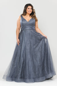 Recibe muchos cumplidos con este vestido largo con cuello en V y purpurina de talla grande de Poly USA W1024. Este hermoso vestido presenta un corpiño sin mangas con cuello en V, adornos de purpurina, prácticos bolsillos laterales, espalda abierta, falda evasé hasta el suelo con cola amplia y espalda tipo corsé con cordones.