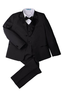 Realza el estilo formal de tu hijo con el conjunto de esmoquin "Prodigy" de 5 piezas de nuestra popular Colección Essentials. Este conjunto completo incluye chaqueta, pantalón, camisa, chaleco y pajarita: todo lo que tu pequeño necesita para lucir elegante en cualquier ocasión.