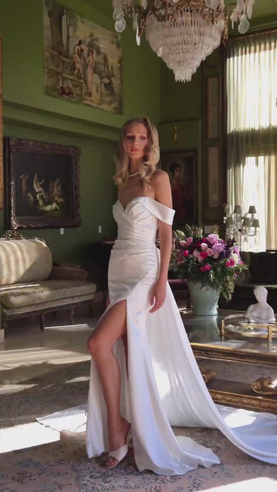 Luce espectacular con este vestido de novia color marfil con hombros descubiertos y abertura, de GLS Gloria GL3545. Con un escote corazón que se extiende hasta los tirantes, el corpiño se ajusta al cuerpo gracias a los pliegues fruncidos en un lateral. La falda se ajusta hasta la abertura. Para rematar, añade un lazo trasero desmontable con cola.