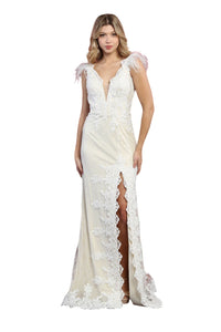 Luce un estilo audaz y glamuroso el día de tu boda con el vestido de novia Royal Queen RQ7925 color marfil. Este espectacular vestido presenta detalles de plumas en los hombros, intrincados adornos bordados en la parte delantera y trasera, y un toque de brillo para un brillo extra. El profundo escote en V, la abertura hasta el muslo y el chal incluido le aportan dramatismo y elegancia. Diseñado con suaves insertos acolchados en las copas, una cola fluida y elástico de cintura para mayor comodidad, mientras que el corpiño estructurado garantiza un ajuste perfecto.