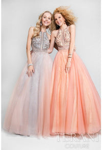 Step into the spotlight with the Terani Couture 1611P1238D prom dress—a show-stopping piece for the modern-day princess. Crafted from soft mesh fabric, this full-length gown features a chic halter neckline and an exquisite lace racerback, designed to turn heads from every angle. The corset back ensures a flattering, secure fit that accentuates your curves, making you feel both sexy and confident.
