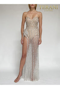 En Formal Dress Shops, nos apasiona ayudarte a encontrar el vestido perfecto para tu ocasión especial. Por eso nos complace ofrecerte este exquisito vestido de fiesta minimalista sin tirantes de Terani Couture. Con su elegante diseño sin tirantes y su silueta fluida, este vestido sin duda llamará la atención en la pista de baile.