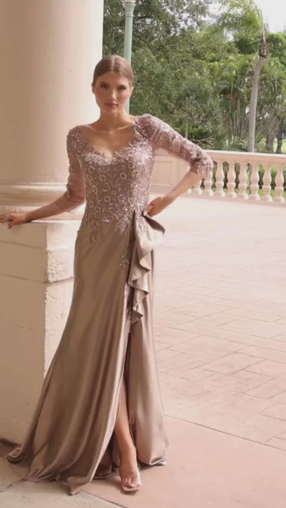 Turn heads in timeless elegance with this Nox Anabel ME126 Embroidered Lace Mother of the Bride Dress, a sophisticated gown designed for refined celebrations. The dress features a flattering V-neckline and three-quarter illusion sleeves, adorned with delicate floral lace appliqués and shimmering beadwork that add depth and luxury to the bodice. A soft satin-finish skirt flows gracefully to the floor, enhanced by a side ruffle accent and a front slit for added movement and allure. The natural waistline creates a figure-enhancing silhouette, making it an ideal choice for mothers of the bride or groom, as well as for formal evening events and special occasions.