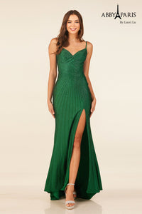 Abby Paris 90304 Beaded Sweetheart Slit Evening Gown by Abby Paris uses knit polyester finished with hand-applied beadwork. It’s fully lined for comfort and features a fitted shape designed to contour the body through sizes 0–12.