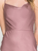 The Amelia Couture 6115 Bridesmaid Dress is an elegant ankle length satin dress featuring a sleek sheath silhouette. This dress showcases a graceful cowl neckline and spaghetti straps that lead to a crisscross upper back design. With a side slit adding a touch of allure, the dress is fully lined for comfort and has a zipper back closure for a secure fit. Perfect for graduation, semi-formal, prom, and homecoming, this timeless piece exudes sophistication and style.