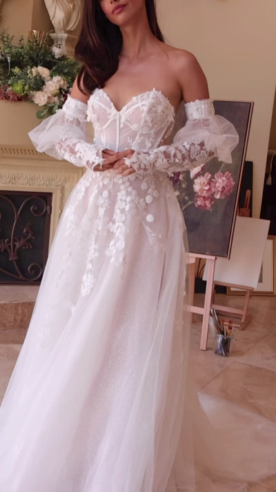 Neckline: Sweetheart, Off-the-Shoulder (detachable sleeves)
