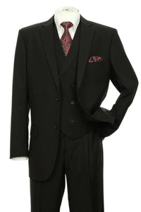 This modern classic suit features a 2 button classic fit jacket, with notch lapel, side vents, a matching double breasted vest, and matching pleated pants.