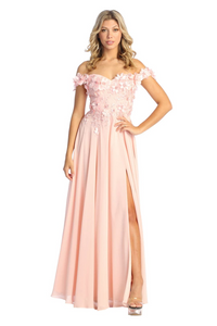 Affordable and chic, these bridesmaid dresses will complement any wedding event Royal Queen RQ7942 Floral Bridesmaid Dress. Radiate style and elegance in this timeless floral bridesmaid dress. Features of this Royal Queen RQ7942 gown: Embellishment on floral applique, off the shoulder, sweetheart neckline, thigh high slit, soft cup padded inserts, shawl, fully lined, a line silhouette, fit & flare, maxi, corset lace up back w/ zipper underneath. Fabric: Hi multi chiffon. Picture perfect as a plus size prom dress, evening gown, or for any formal event.