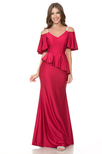 Make a lasting impression in the satin Lenovia 5282 mermaid gown, designed with embellished spaghetti straps, ruffled off-the-shoulder sleeves, and a chic asymmetrical waist. The soft cup padded bodice offers a flattering, fitted silhouette that enhances your curves, while the open back with zipper closure adds a bold, elegant finish. Ideal for prom, galas, or red-carpet events.