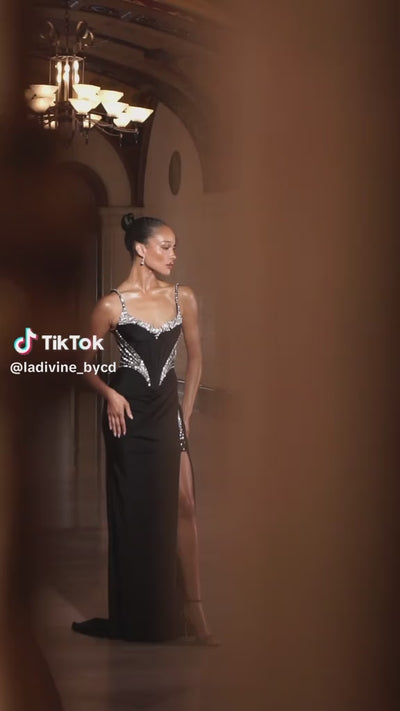 Embellished Spaghetti Strap Evening Gown with High Slit Sparkly Corset by Cinderella Divine CD390