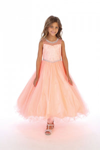 Let her shine like a princess in this stunning girls' pageant dress. This elegant ball gown features a sleeveless bodice beautifully adorned with sparkling rhinestones and shimmering beadwork, adding the perfect touch of glamour. The illusion neckline is accented with crystal embellishments, while the waistband is detailed with matching rhinestones for added sparkle. The full-length tulle skirt features layers of soft netting with a curly hemline, providing volume and movement that's perfect for pageants, flower girl duties, birthdays, or any special occasion. The dress comes with a matching flutter-sleeve bolero jacket for versatile styling. The back features a sheer panel with rhinestone details and a secure zipper closure.