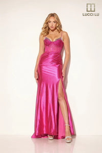 Glitter Fitted Sleeveless Slit Gown by Lucci Lu 1385 stands out with intense sparkle and a tailored cut. Statement-maker? Honestly, it's pretty much designed for those 'remember-this' entrances.