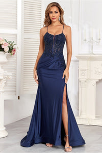 The gown is crafted from lace and satin for a smooth, structured finish.