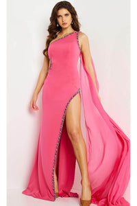 A sheer draped sash attached to the single strap flows effortlessly, giving the gown a graceful and romantic movement. Designed with a sexy thigh-high slit and a sweeping train, this dress ensures a dramatic, head-turning entrance. The sheath-style skirt tapers elegantly to the floor-length hem, creating a poised and sophisticated profile that highlights your natural curves. Whether attending a gala, prom, red carpet, or black-tie wedding, this Jovani evening gown delivers timeless style with modern glamour.