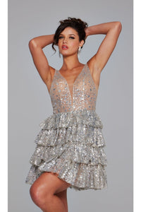 Here's a gorgeous ruffled short glitter homecoming dress 39700 that is sure to give you a spectacular look. With glittery embellishments from the sheer bodice to the hem, this short designer dress from Jovani is ready to shimmer and shine with every move you make. The short gitter party dress has a short a-line skirt that flows to the hem in ruffled tiers for a figure-flattering look at homecoming, cocktail parties, and other semi-formal events. A tantalizing symphony of sparkle and sensuality, this ruffled short glitter homecoming dress is ready to stand out at your next big event.