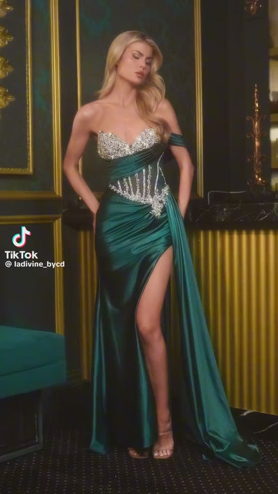 Crafted from a satin stretch fabric, the skirt flows smoothly down, hugging your figure comfortably while allowing graceful movement. A dramatic leg slit provides a hint of allure, making it ideal for high-profile occasions. The flowing side sashDetail adds a touch of drama, making the gown feel effortlessly glamorous.
