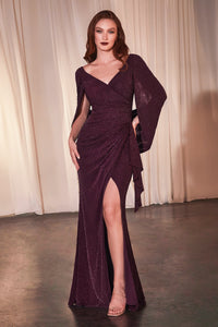 Ladivine CH386 Long Fitted Draped Caped Gown in Wine