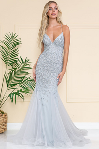 Step into elegance with this stunning Amelia Couture SU066 mermaid gown, featuring 3D floral appliques, beaded detailing, and a plunging V-neckline with thin straps. The fitted bodice includes soft cup padding for comfort, while a lace-up back with an underneath zipper ensures a perfect fit. Finished with a dramatic horsehair hem, it’s ideal for galas, prom, and red-carpet events.