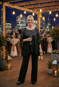 The Eva USA approach focuses on streamlined lines and a crisp, versatile silhouette, blending an attached cape overlay with a relaxed wide-leg pants fit. The smooth fabric drapes nicely, and strong seams keep things feeling secure–whether you’re on the dance floor or simply catching up with relatives at the reception.