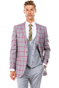Introducing the Men's One Button Peak Lapel Grey & Red Windowpane Plaid Suit by Tazio Suits — a look that commands attention without trying too hard. Crafted for those who appreciate a modern twist on classic suiting, this ensemble combines sleek design details with versatile styling. The jacket boasts a striking windowpane pattern in grey and red, giving it a bold yet refined presence. The one-button front closure and peak lapels add a sharp silhouette, while the interior French facing ensures a clean, tailored finish.