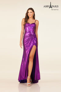 \nFormal Dress Shops offers authentic products, including the Metallic Corset Slit Gown by Abby Paris 90287, fast shipping, and helpful support. Shop with confidence thanks to easy returns and careful quality control.