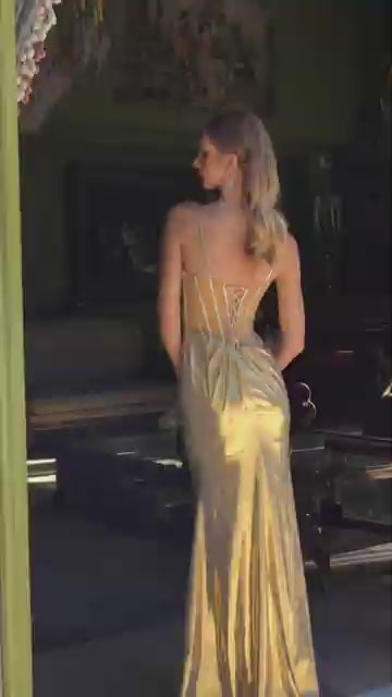 Questions about Metallic Sleeveless Slit Gown by Elizabeth KGL3597, sizing, or delivery? We’re just an email away.