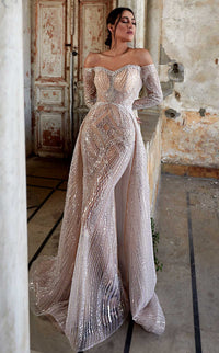MNM Couture K3950 Beige Off-Shoulder Gown with Embellished Overskirt Sale price$1,500.00
