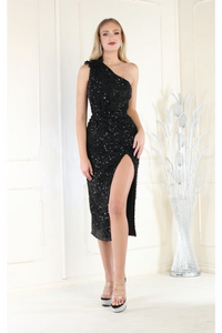 Ring in the new year with sophistication in the May Queen MQ1967 cocktail dress. The classic black hue offers a timeless look, while the unique one-shoulder design adds a modern twist. The intricate sequin embellishments shimmer with every movement, ensuring all eyes are on you. Perfect for any upscale event, this dress combines style and comfort in one unforgettable package. Embrace the evening in black, and let the glamour and grace of this dress shine
