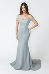 Elegance meets grace in the Lenovia 8134 off-shoulder formal gown, perfect for making a show-stopping entrance at any special occasion. This figure-flattering mermaid silhouette features a sweetheart neckline with elastic arm bands for added comfort and style. The bodice is richly embroidered with intricate lace and sparkling stones, continuing seamlessly into a crepe floor-length skirt that finishes with a sheer mesh contrast train adorned with matching embroidery. Fully lined with built-in bra cups and a hidden back zipper, this gown ensures a secure, confident fit for prom, formal, weddings, galas, and more.