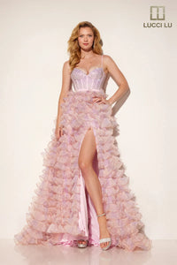 Organza Sleeveless Ruffled Slit Gown by Lucci Lu 1400 by Lucci Lu features structured organza layered over polyester and a fully-lined interior for comfort. Designed with a corset-boned bodice and bra cups for a secure fit. Available in sizes 0, 2, 4, 6, 8, 10, 12, 14, 16, 18, 20.
