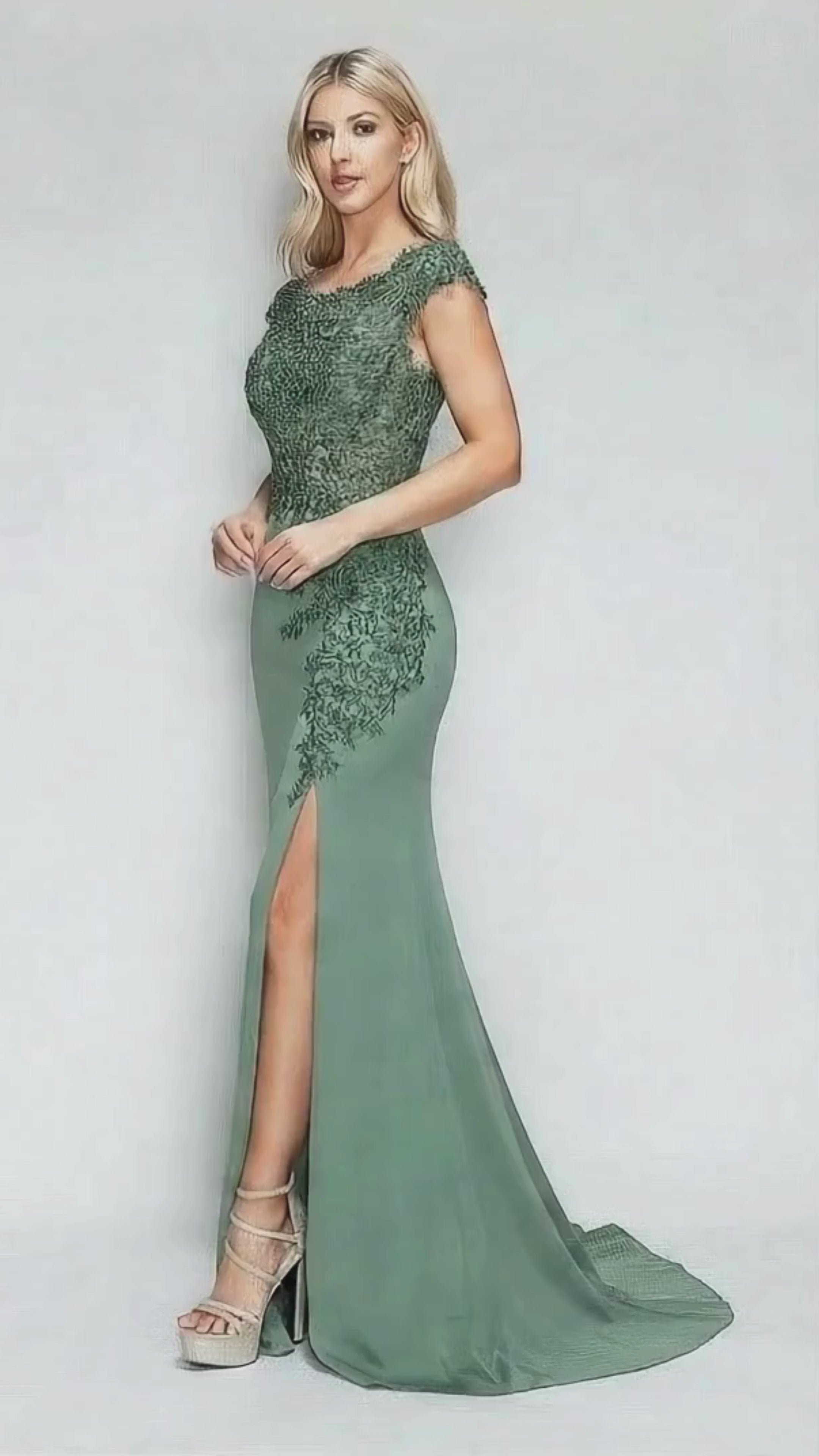 Make a lasting impression in the Lenovia 8343 sheath gown, designed with a boat neckline, cap sleeves, and a sheer fitted bodice embellished with intricate beading and floral embroidery. Soft cup padded inserts ensure a flattering fit, while the flowing cap, daring high slit, and matching shawl add dramatic flair and elegance. This gown is crafted from smooth satin with a concealed zipper, making it an ideal choice for galas, red carpet events, and pageant occasions.