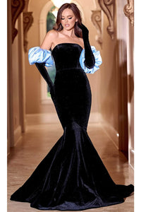 Step into elegance and sophistication with the Portia and Scarlett PS24084 evening gown, a luxurious statement piece designed to turn heads at any formal event. Crafted from premium velvet, this gown celebrates feminine beauty with impeccable tailoring that enhances the natural silhouette. The strapless design features a straight-across neckline, highlighting the shoulders and collarbone with timeless allure. A midrise back ensures a comfortable yet polished fit, while detachable puff sleeves offer versatile styling options for a personalized look. The trumpet skirt gracefully flares from the hips, flowing into a sweeping train that adds dramatic sophistication, making every entrance unforgettable. Perfect for gala nights, proms, weddings, or black-tie events, this gown seamlessly blends modern charm with classic refinement. Available in captivating Black Blue and Black Pink shades, it exudes confidence and elegance.