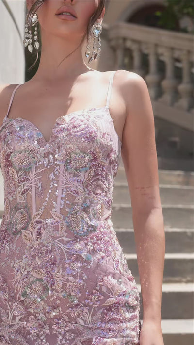 The Portia and Scarlett PS25199 Prom Dress captures the perfect blend of elegance and romance. Designed in a sleek sheath silhouette, this piece features dainty spaghetti straps and a corset-boned bodice that accentuates every curve. Exquisite floral appliqués and shimmering sequins grace the tulle fabric, creating a dreamy sparkle with every movement. Finished with a sweetheart neckline, tie-up back, and a flowing sweep train, this gown is the ultimate choice for prom or any special occasion where you want to leave a lasting impression.