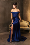 Dazzle in this show-stopping May Queen MQ2146B sheath gown, designed to captivate. It features a sheer corset bodice with shimmering sequins, ruched and pleated details, and a sultry high slit. The off-shoulder neckline adds elegance, while the lace-up and zipper back Sweep Train ensures a perfect fit. It's made for grand entrances.