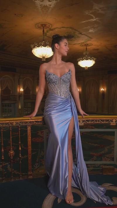 Satin Corset Evening Gown with Beaded Bodice & High Slit Strapless Formal Prom Dress by Cinderella Divine CD722