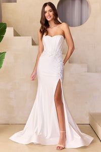 Step into refined elegance with the Amelia Couture 7057 white satin sheath bridal gown. This timeless silhouette features a structured corset bodice adorned with delicate floral appliqués and shimmering beaded embellishments. The strapless sweetheart neckline highlights your décolletage, while a high side slit and lace-up open back add a modern, romantic touch. Complete with a graceful sweep train, this gown is perfect for weddings, bridal showers, or engagement celebrations.