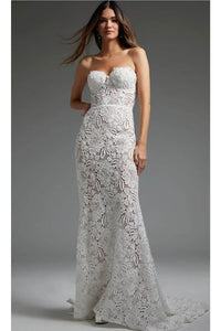 Indulge in timeless bridal elegance with the Jovani JB38271 white sheath gown—a breathtaking choice for your unforgettable day. Embellished with intricate beaded floral lace, this gown beautifully captures romance and sophistication. The strapless sweetheart neckline and structured bustier bodice sculpt a flattering silhouette, while the nipped waist adds a graceful touch of glamour. A midrise back with a concealed zipper and delicate button detailing ensures a seamless, refined finish. The sleek sheath silhouette flows into a sweeping train, creating a look that is both graceful and unforgettable. Model is wearing the Off-White color.