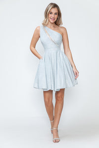 Stand out in sophisticated style with the Silver Graduation Dress by Lenovia 5272, a stunning one-shoulder A-line design perfect for your milestone moment. Featuring an asymmetrical neckline and embellished lace details, this short dress blends glamour with elegance. The layered glitter fabric adds radiant sparkle, while soft cup padding ensures comfort throughout your celebration. A unique double strap back with zipper closure offers both style and a secure fit. Ideal for graduation ceremonies, parties, and semi-formal events, this sleeveless dress delivers a bold yet refined look that’s sure to turn heads.