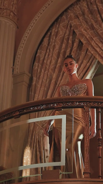 This gown isn’t just for the red carpet—though it’s perfect for those high-profile moments—think galas, pageants, and formal soirées. The gold satin shimmer and intricate beading details make it ideal for occasions where you want to sparkle and stand out without saying a word.