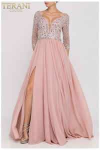 Step into timeless elegance with the Terani Couture 2011m2464 long dress, a sophisticated choice for weddings, galas, proms, and evening events. Designed with quarter-length sleeves and a flattering V-neckline, this gown beautifully balances modern style with classic charm. The flowing A-line silhouette effortlessly drapes over the body, creating a graceful and feminine look, while the full-length hemline extends into a subtle sweep train for added drama and poise. Fully lined for comfort and a flawless fit, this formal dress is perfect for creating unforgettable moments at any special occasion. Crafted with attention to detail, this dress ensures you exude confidence and glamour from every angle.